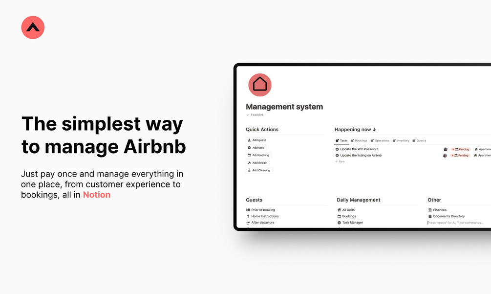 With this Notion Template you'll only have to pay once, you can manage unlimited rentals and you'll obtain an all-in-one management space. Save time, save money and guarantee your guests the best Airbnb experience.