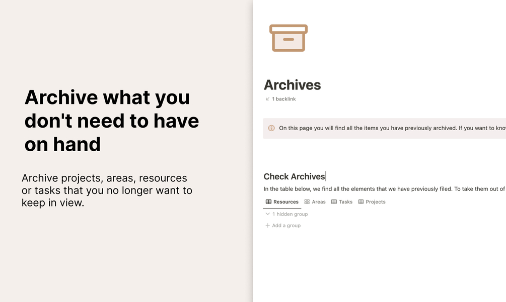 • You will have the power of the PARA System: a system that helps to organize projects, areas of our life and resources we consume (articles, notes, courses, videos).