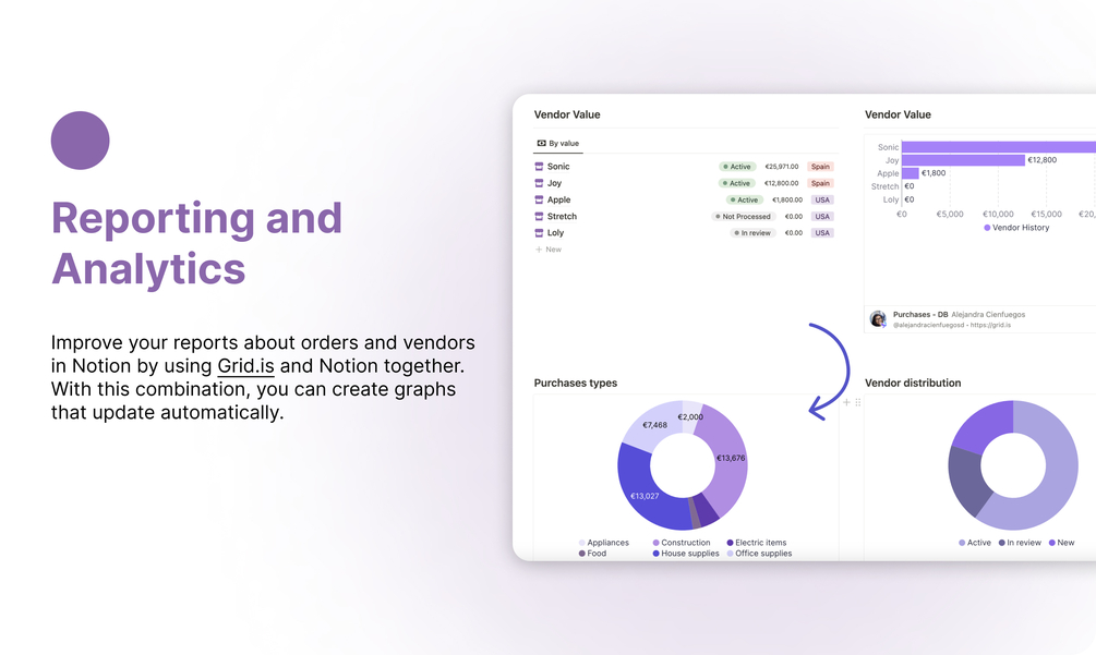 - Reporting Space to share analytics related to orders/purchases and vendors