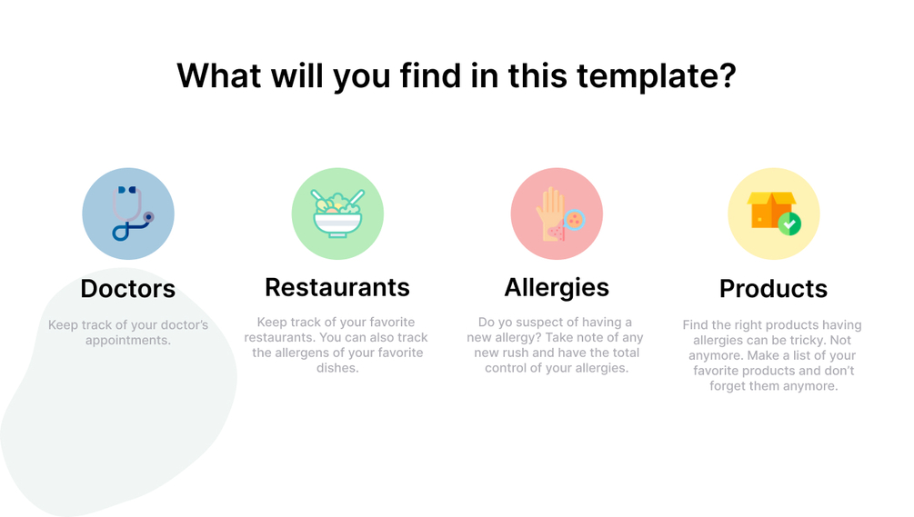 The Allergy Dashboard is based on a food diary that will help you track, not only your meals but also any symptom that occurs. Once you pinpoint a food that seems to trigger symptoms you can document all within Notion and have reliable information for your next doctor appointment.